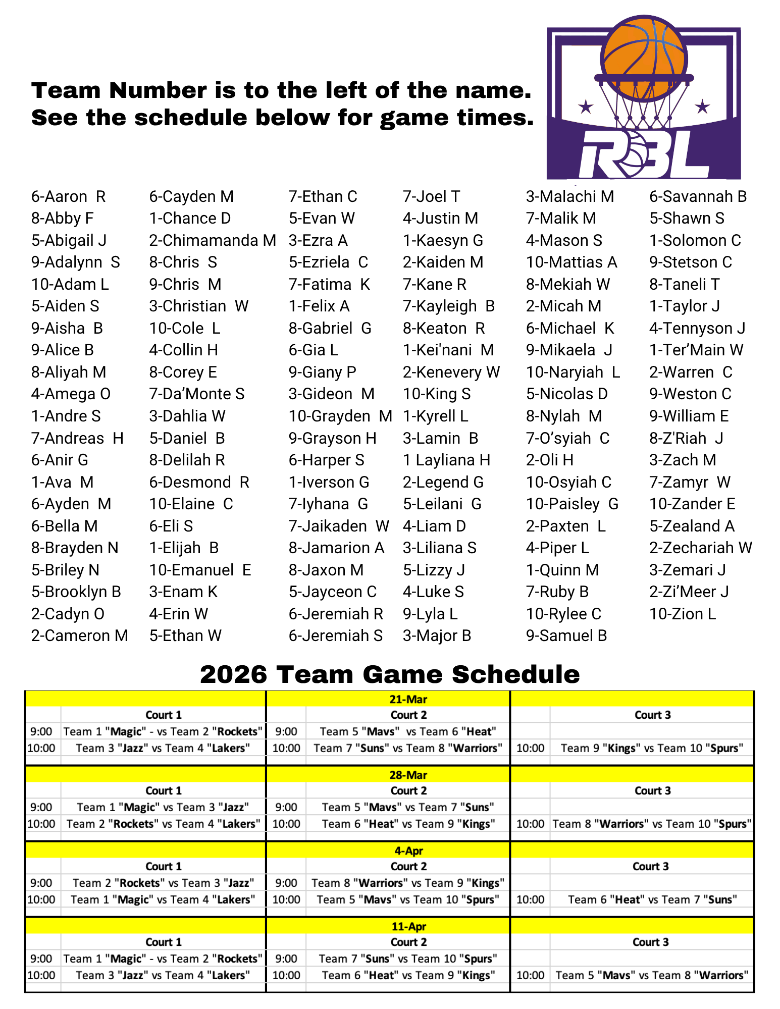 Team assignments & game times are below!