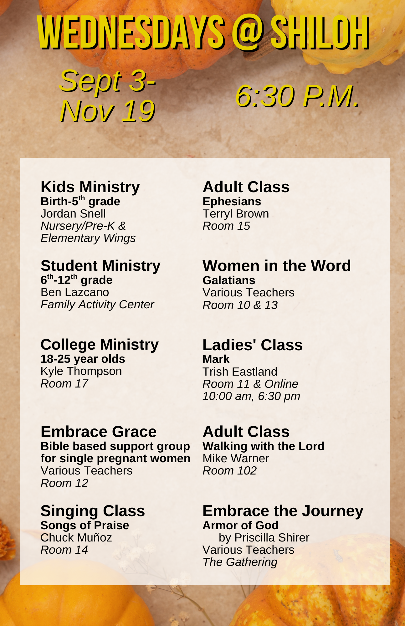 Join us Sunday mornings at 10:30 a.m. and Wednesday evenings at 6:30 p.m.! We have something for ALL ages!